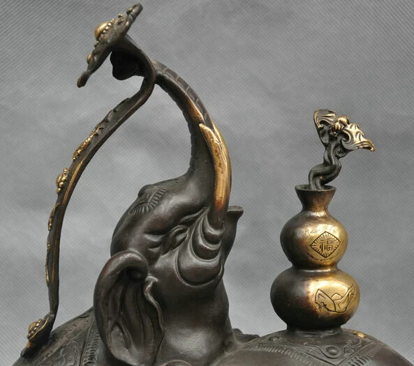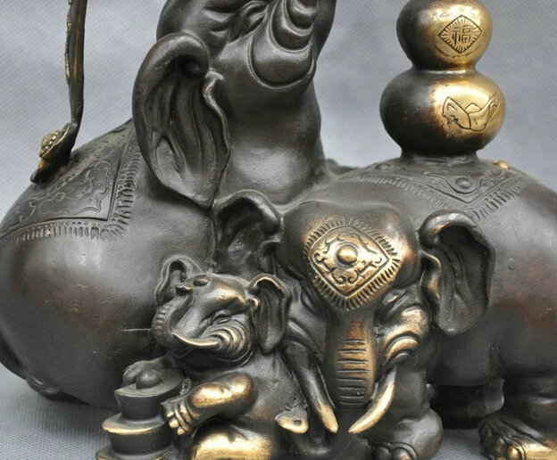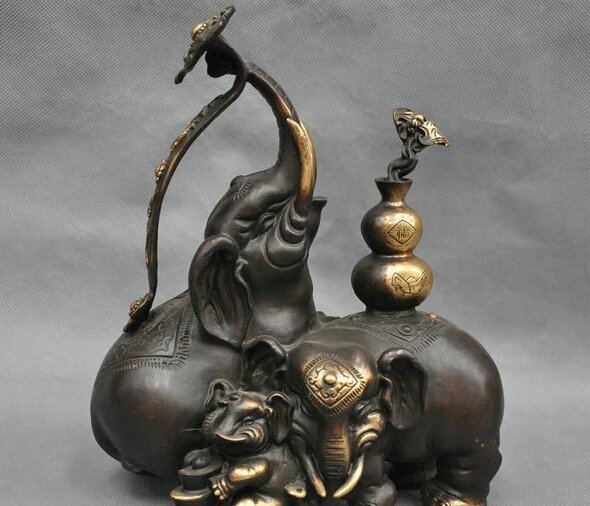 HIGH QUALITY 10'' China Folk Auspicious 3 Elephant Family Ruyi Yuanbao Gourd Bronze Statue R0712