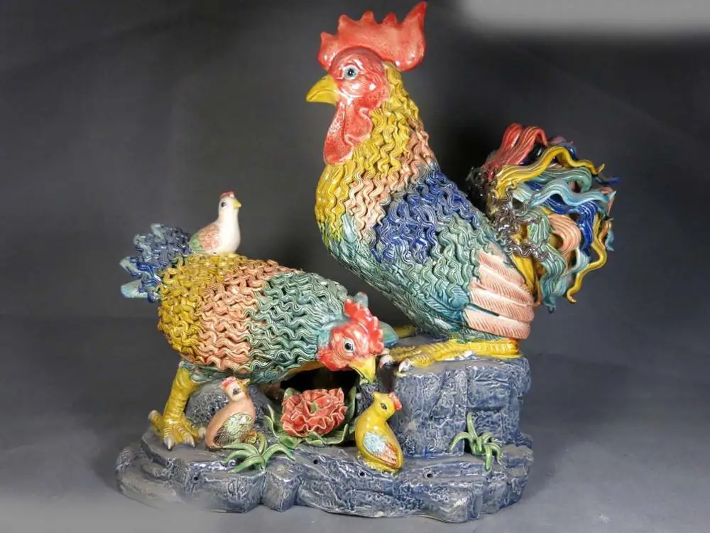 BEST 14" China handmade fine koji pottery sculpture Lucky rooster family Statue